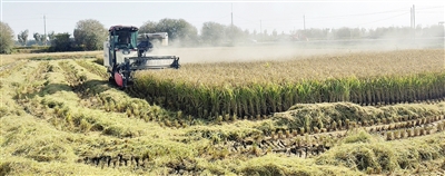 10月下旬,塔克拉瑪干沙漠邊緣,農機的轟鳴聲劃破了田野的寧靜,新疆和田地區于田縣的天津小站稻試種基地迎來了大面積豐收。