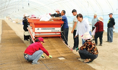 農業專家王連芬(前排站立者)和種植戶一起育秧。